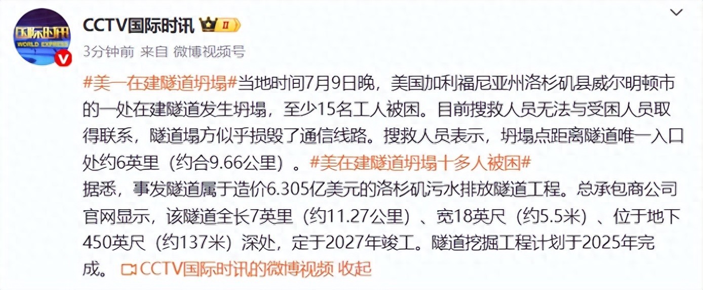 当地时间7月9日晚,美国加利福尼亚州洛杉矶县威尔明顿市的一处在建隧道发生坍塌,至少15名工人被困。目前搜救人员无法与受困人员取得联系,隧道塌方似乎损毁了通信线路。搜救人员表示,坍塌点距离隧道唯一入口处约6英里(约合9.66公里)。据悉,事发隧道属于造价6.305亿美元的洛杉矶污水排放隧道工程。总承包商公司官网显示,该隧道全长7英里(约11.27公里)、宽18英尺(约5.5米)、位于地下450英尺(约137米)深处,定于2027年竣工。隧道挖掘工程计划于2025年完成。