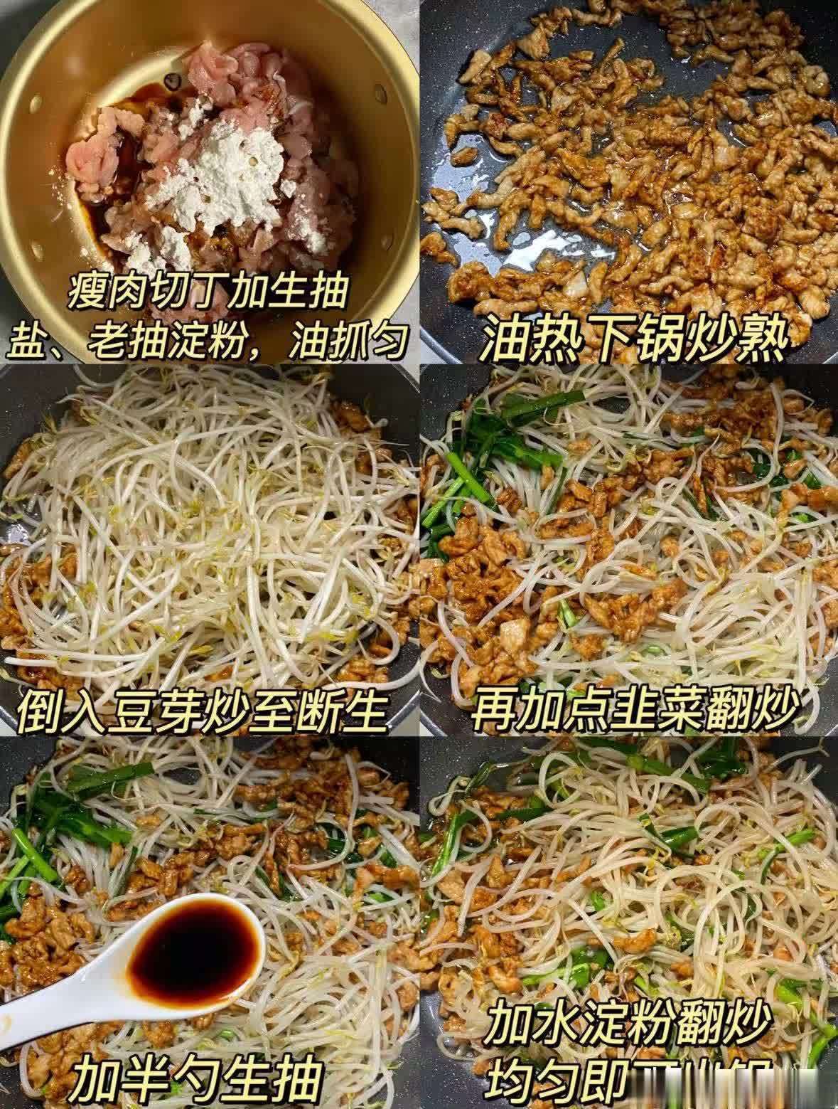 瘦肉、绿豆芽、韭菜、生抽、盐、老抽、淀粉、食用油、水淀粉