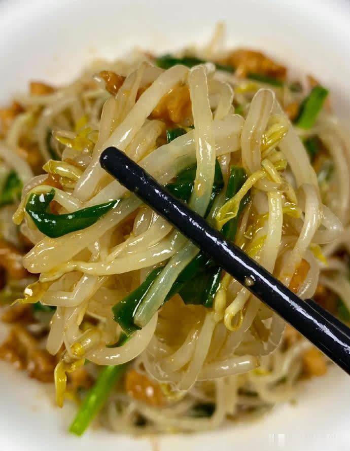 3. 倒入绿豆芽炒至断生,加入韭菜继续翻炒。